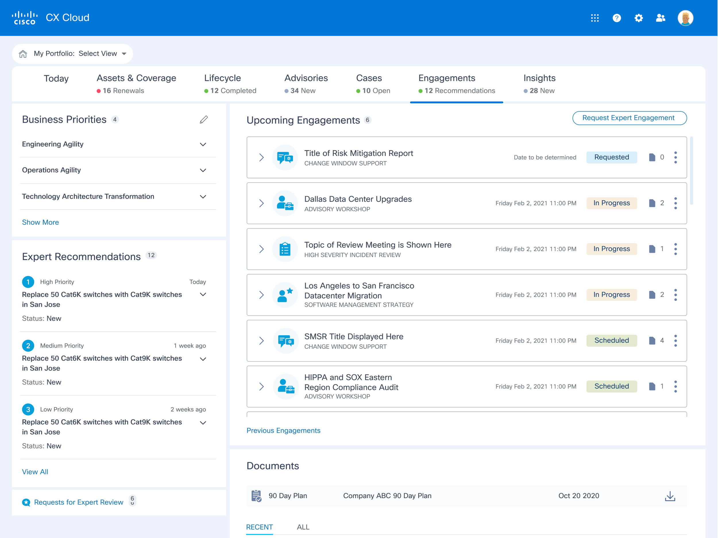 Dashboard Overview: Focuses on business outcomes, expert recommendations, and upcoming engagements.